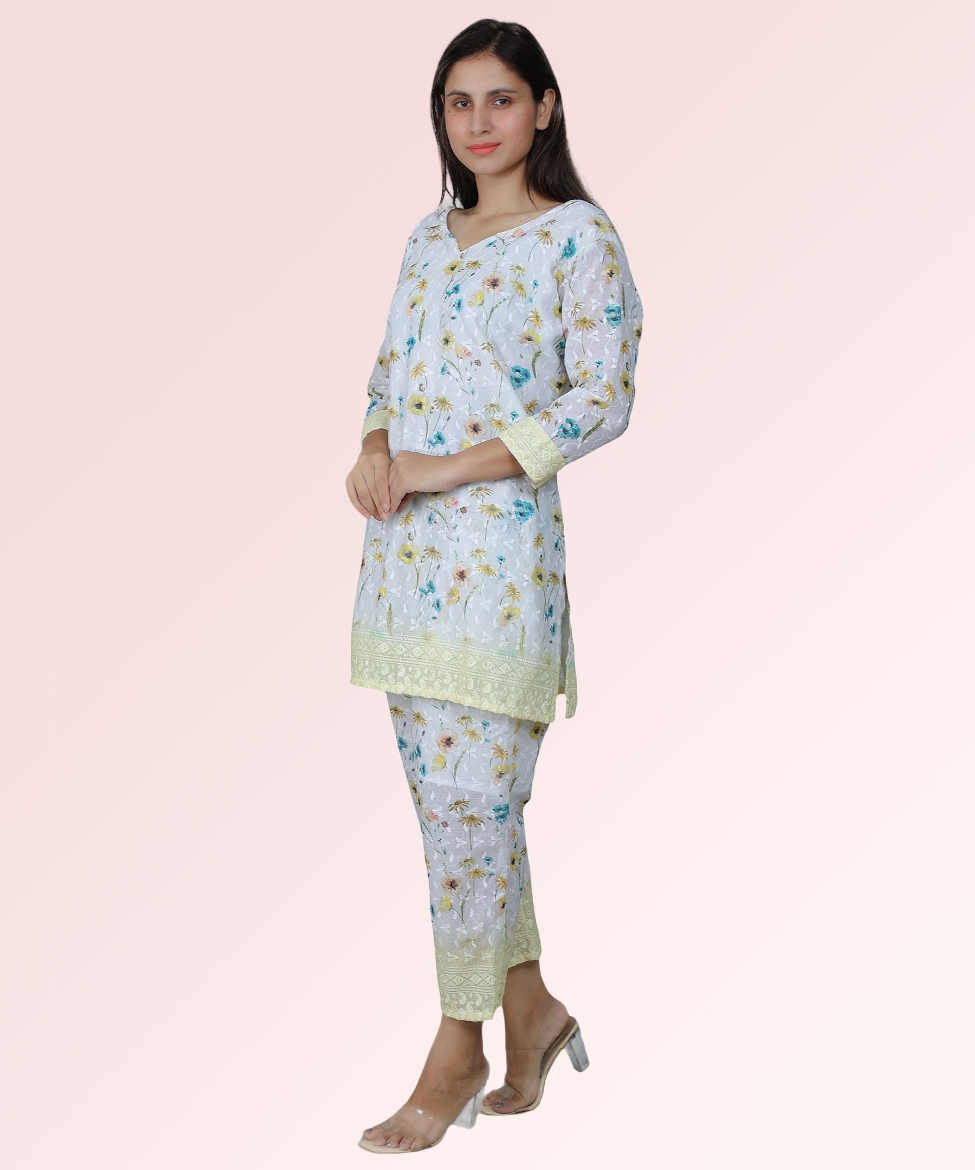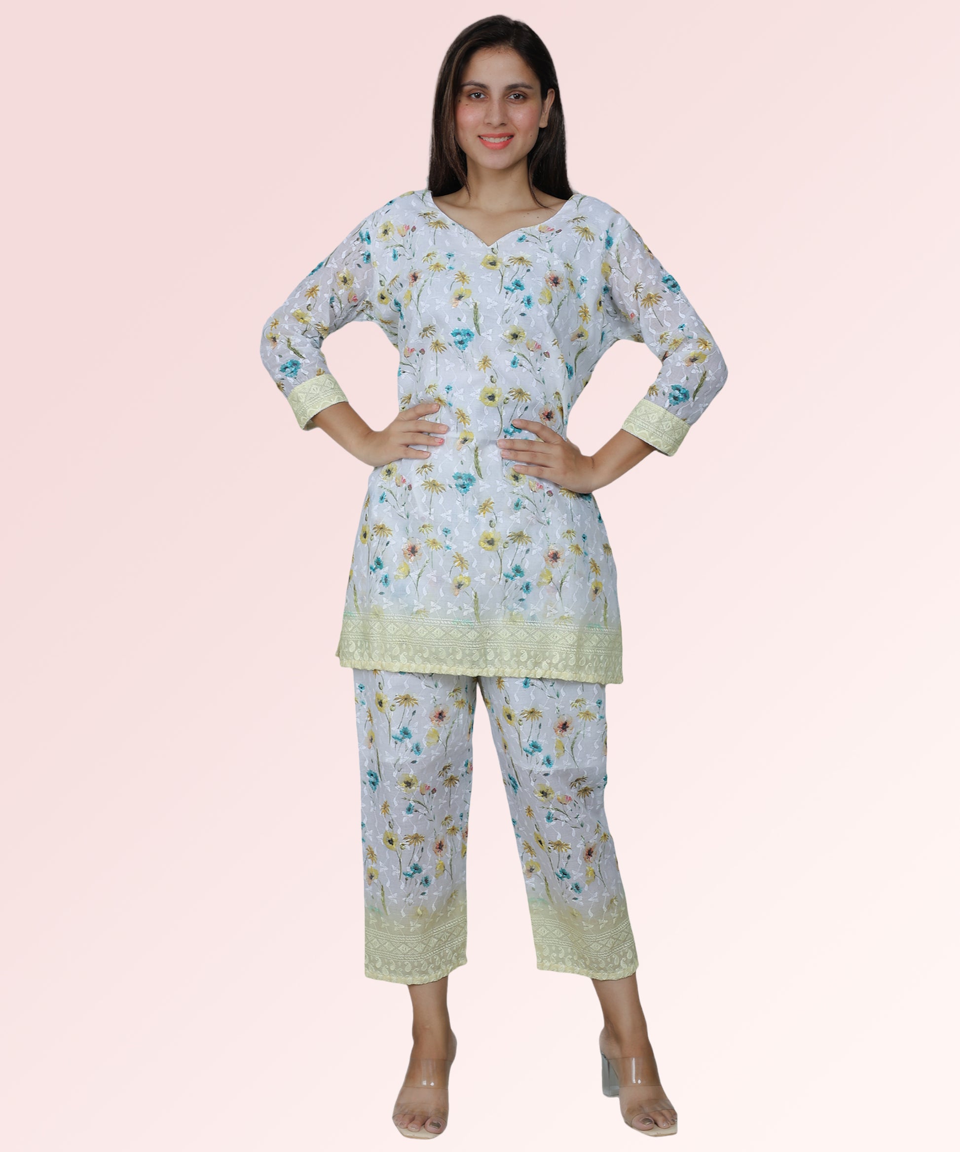 Light Green Floral Print Chikan Embroidered Kurta Set